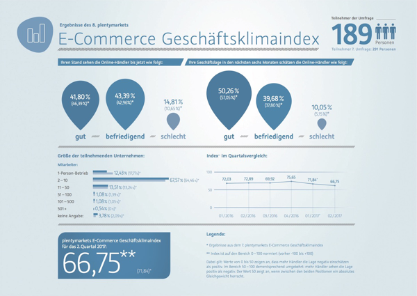 plentymarkets bedankt sich herzlich bei allen, die an der Befragung teilgenommen haben. Gemeinsam mit shopanbieter.de wird der plentymarkets E-Commerce Geschäftsklimaindex alle drei Monate erhoben, um damit ein verlässliches Stimmungsbarometer zur künftigen Marktentwicklung im E-Commerce zu etablieren. Der 8. plentymarkets E-Commerce Geschäftsklimaindex wurde zudem von Skrill gesponsert.